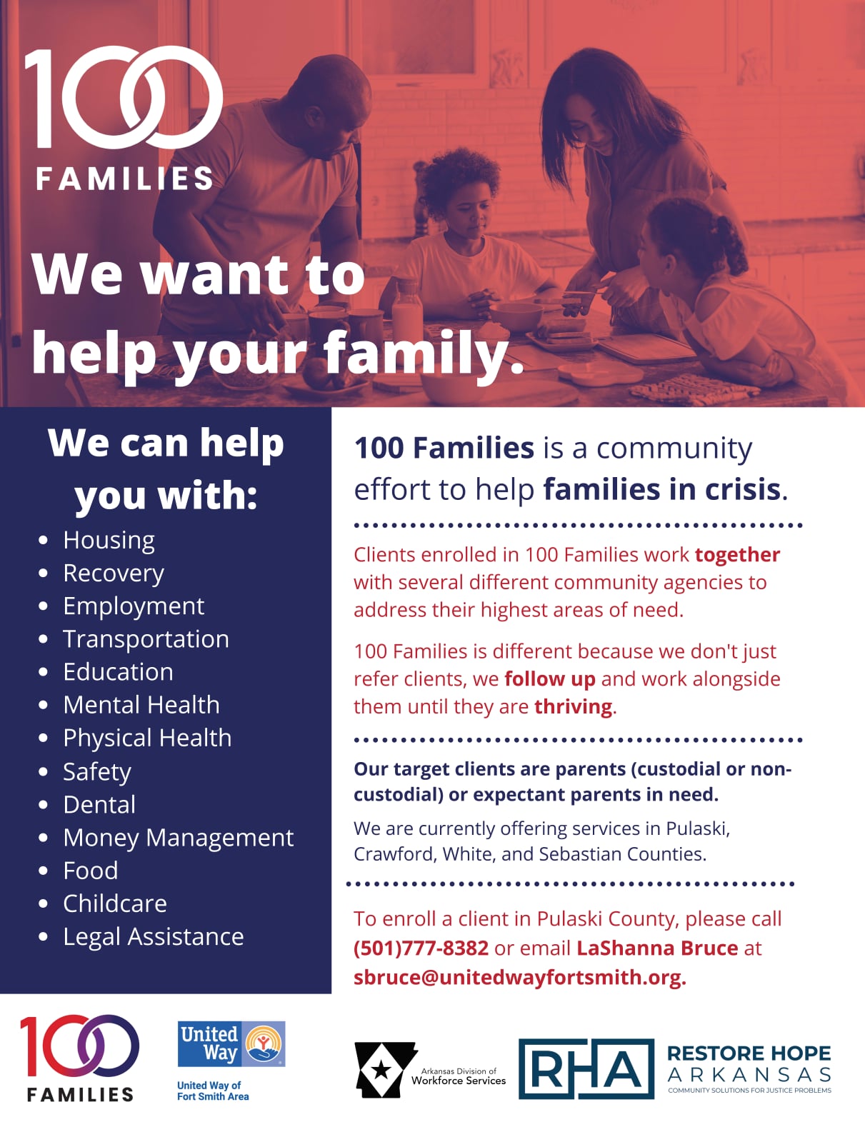 Are you a parent who needs help with employment, housing, transportation, or childcare?! We’re proud to partner with a local nonprofit, Restore Hope, in their new 100 Families initiative in Pulaski County.