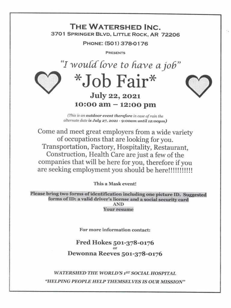 JOB FAIR HOSTED BY WATERSHED ON JULY 22, 2021 Posted byPulaski County Adult EdJuly 13, 2021Posted inUncategorized Published by Pulaski County Adult Ed Serving the greater Pulaski County, Arkansas area in all aspects of adult education, including GED, WAGE, IET, ESL, and CRC View more posts