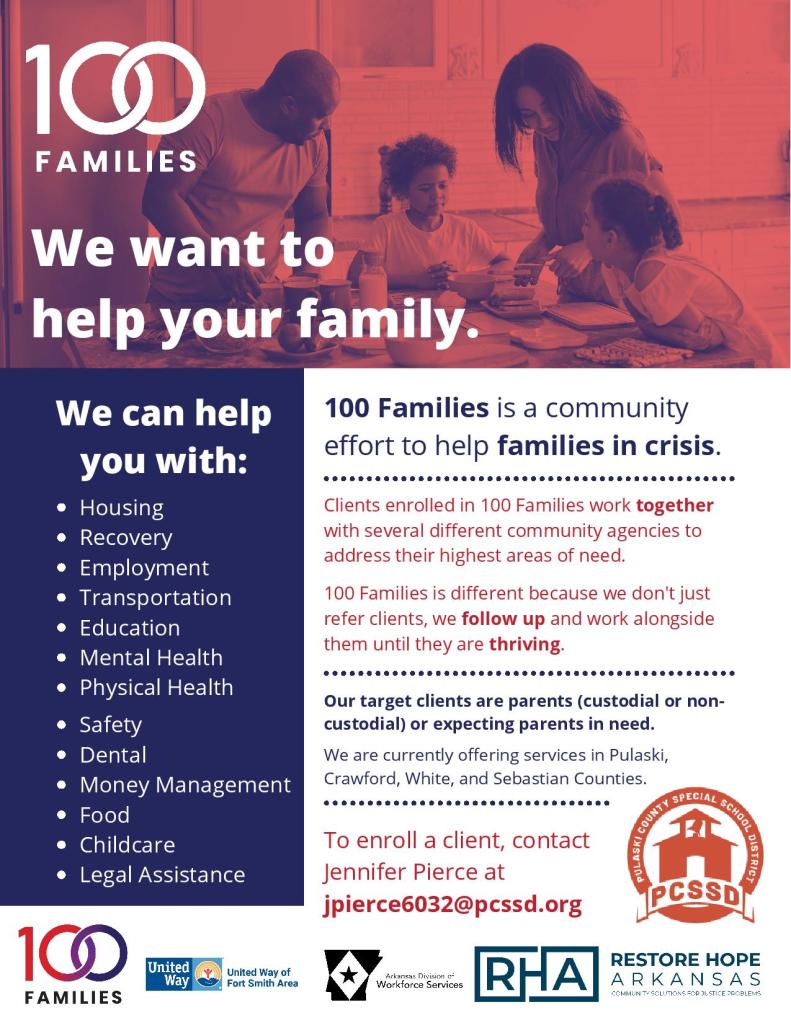 Pulaski County Adult Education has partnered with the nonprofit, Restore Hope, on a local initiative called 100 Families with the goal of bringing at least 100 families from crisis to career. Our program has a TANF Coordinator who can assist students with the enrollment process as well as assistance related to employment (resume development, job search, workforce skills) as well as referral to other area services and resources that may be needed (area food pantries, employment opportunities, healthcare, mental health, etc.)
